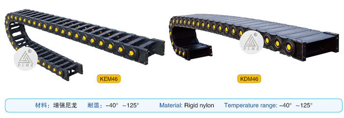 DLMA-KEM46、KDM46系列加强型拖链(尼龙接头) 适用于玻璃机械、搬运机械、涂装设备、制鞋机械、化工机械、纺织机械、焊接机械、自动焊系统、塑料机械等设备配套和维修。全封闭拖链适用于木工机械、灰尘多的车间。